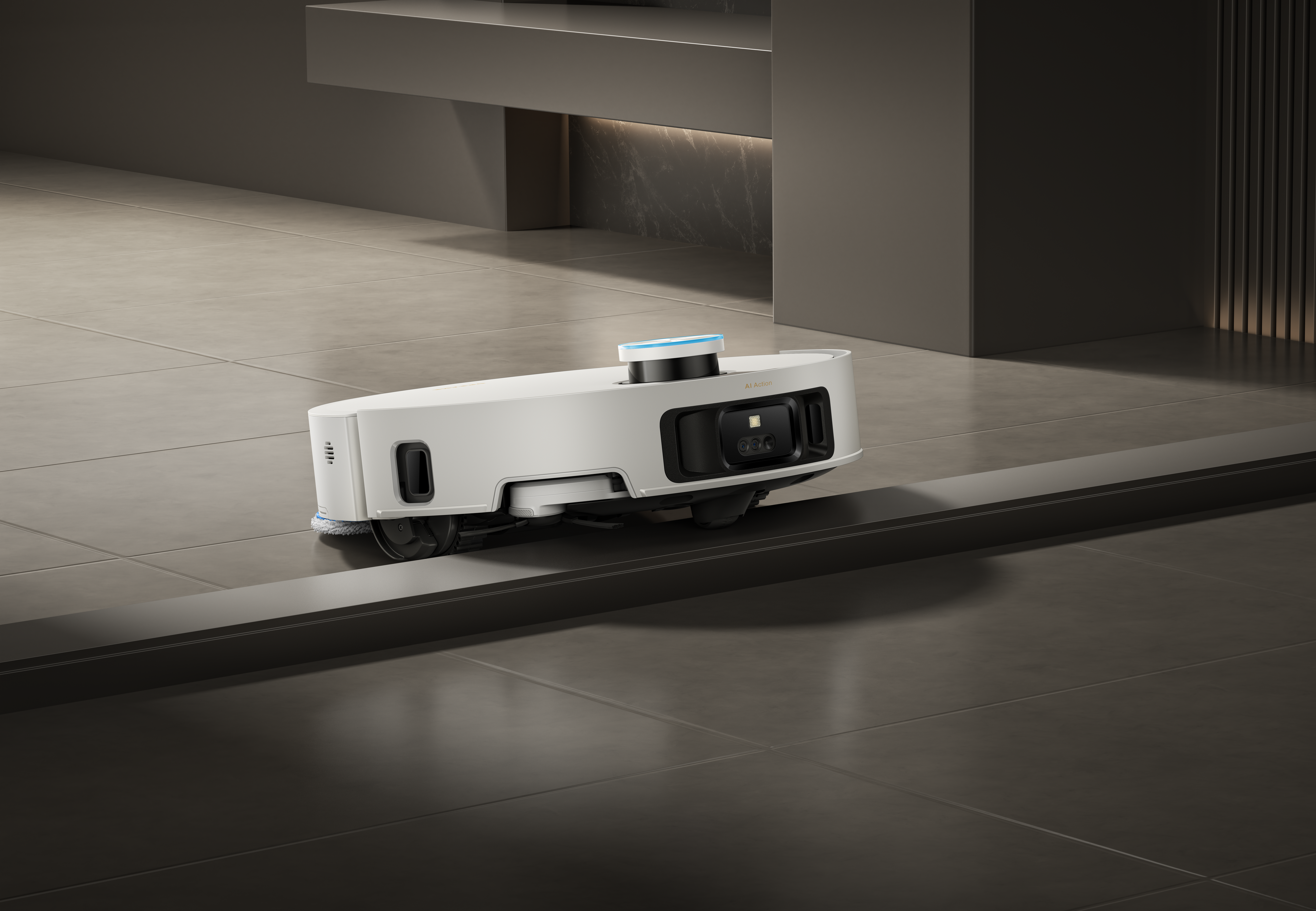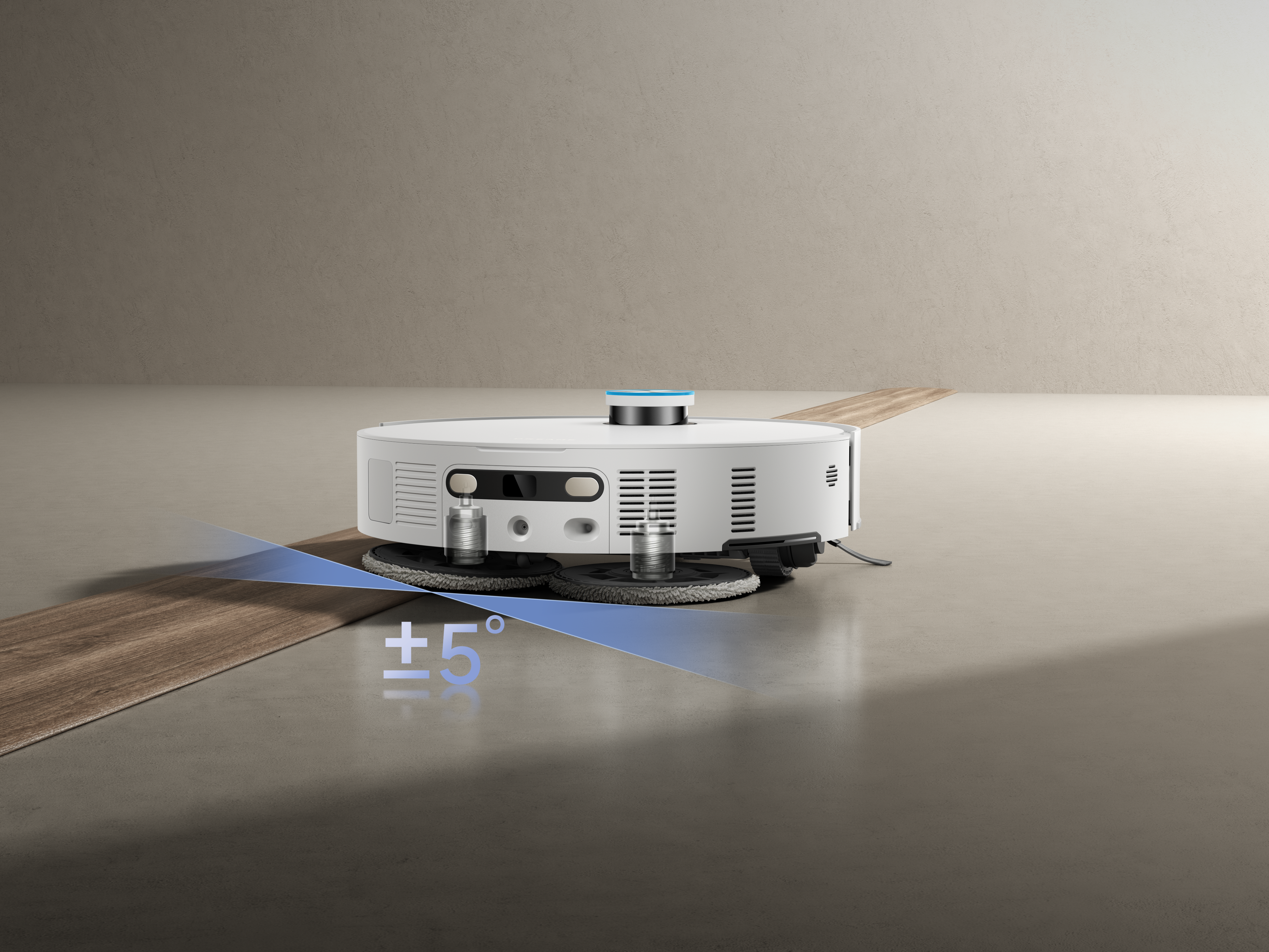 The Dual Omni-Scrub Mopping system automatically adjusts its tilt to maintain full contact with uneven floors and thresholds, improving cleaning performance on textured or sloped surfaces.