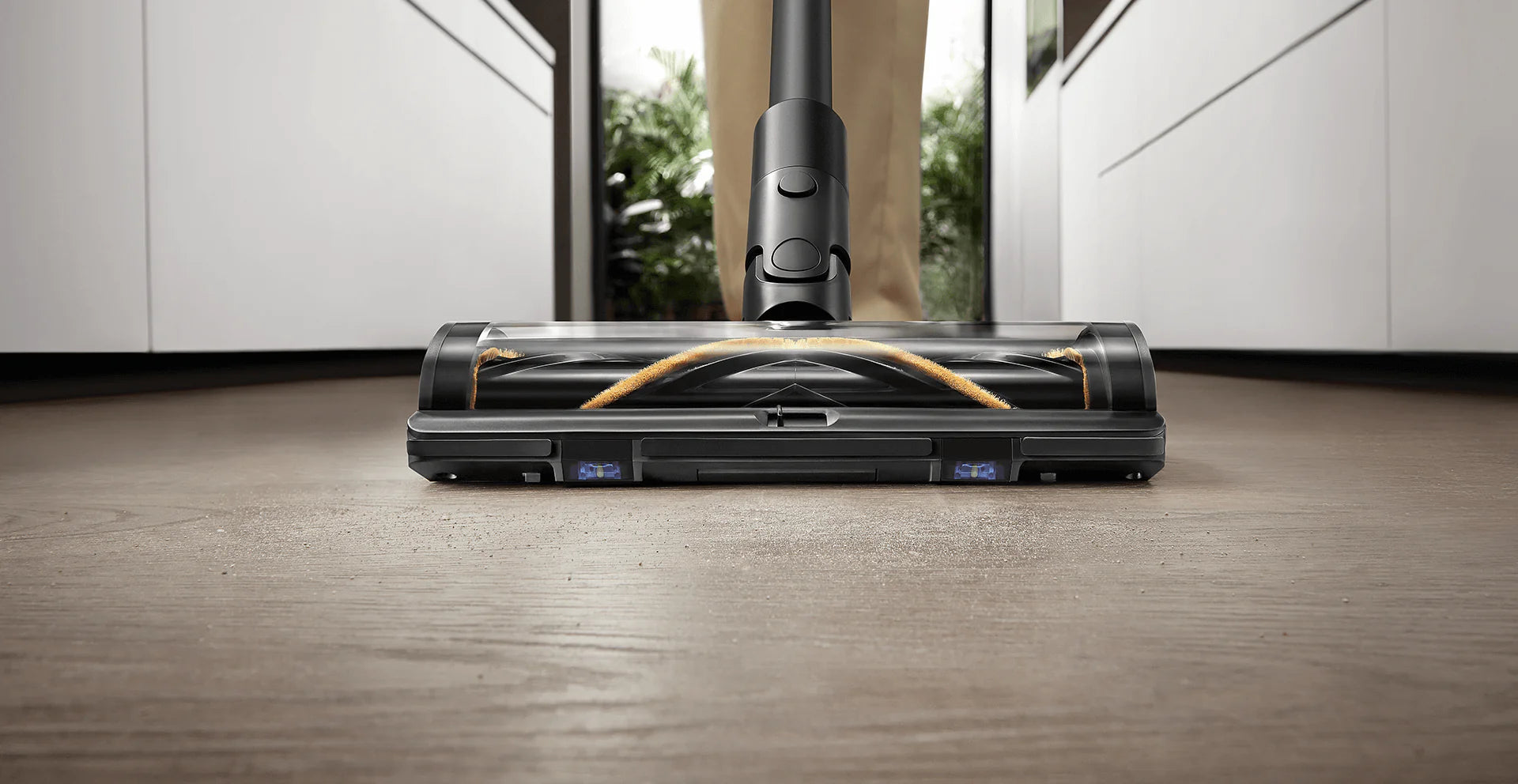 The soft roller brush equips with a celeste light to expose hidden dust while efficiently cleaning hard-to-reach edges on hard floors. With a reduced 7mm* distance to the wall, it tackles side cleaning challenges and picks up debris along baseboards smoothly.