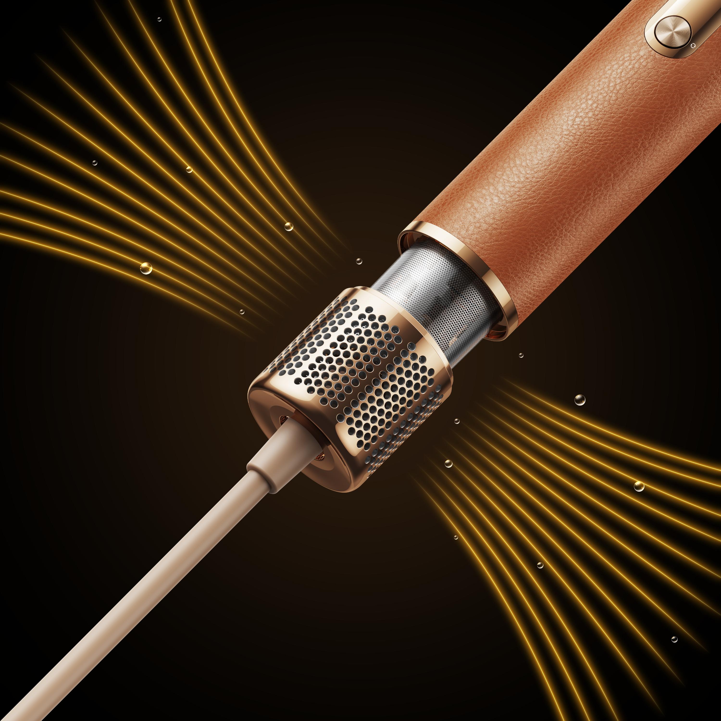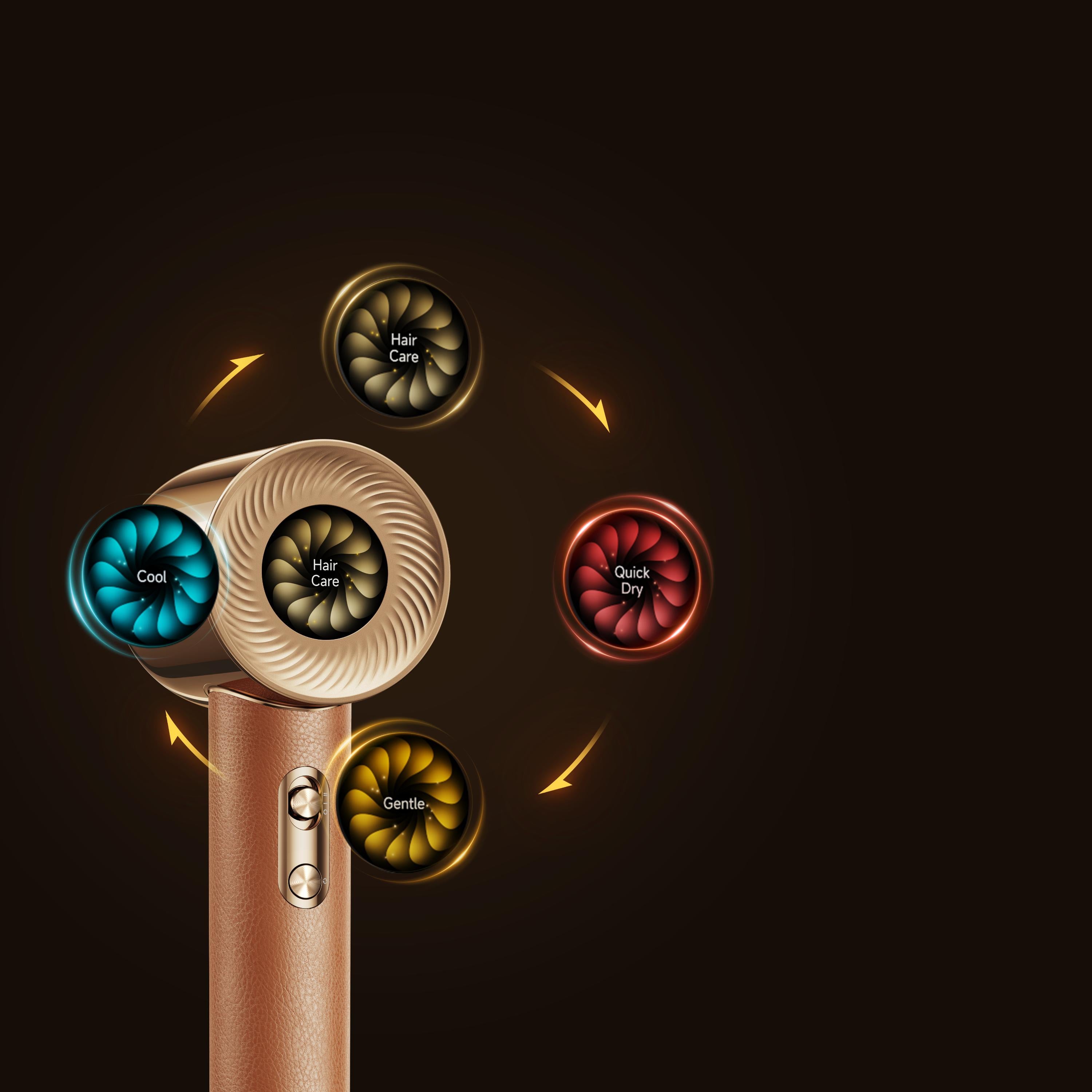 Su unikalios konstrukcijos 130 000 sūkių per minutę* varikliu, sukuriančiu didelį 70 m/s oro srautą, prietaisas efektyviai šalina drėgmę ir užtikrina 55 m/h oro srautą. Dėl to, plaukai greitai išdžiovinami dėl didelio oro srauto greičio ir kiekio.