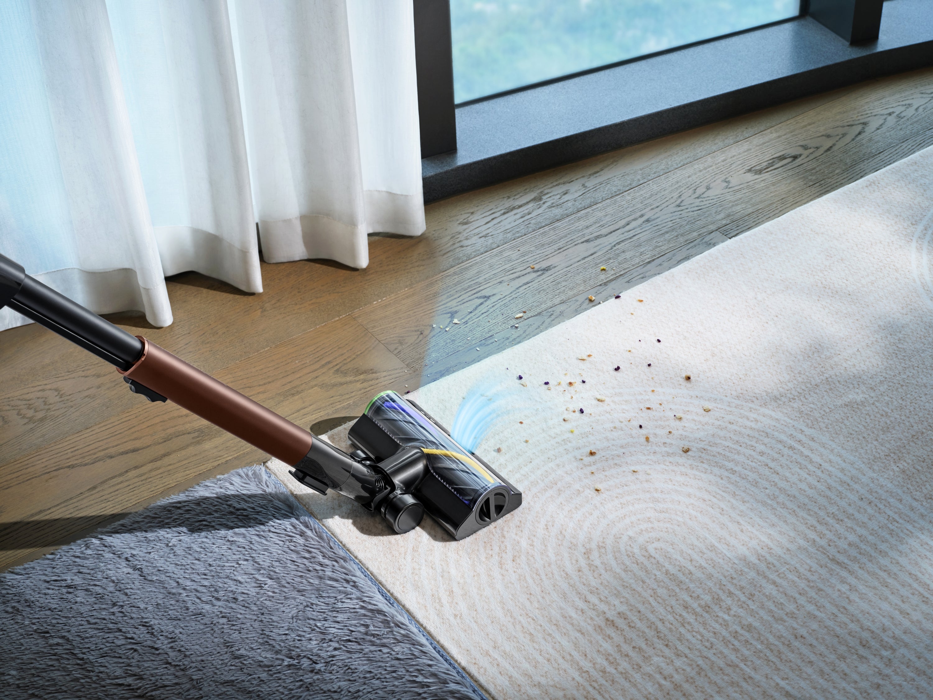 Dinaminis šepečio galvutės dizainas prisitaiko prie įvairių paviršių ir net ilgo plauko kilimų. Tai leidžia valyti sklandžiai ir nepertraukiamai.